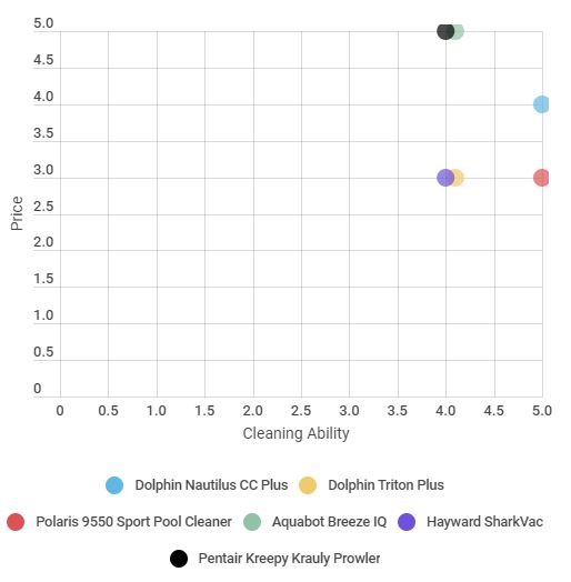 I plotted my cleaning power scores vs. price on this scatterplot to create a chart where you can easily see what the best value for your dollar is. The Dolphin Nautilus CC Plus stands out from the competition, but Pentair and Hayward robotic cleaners are also a good value.
